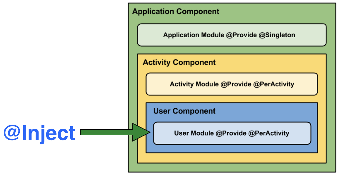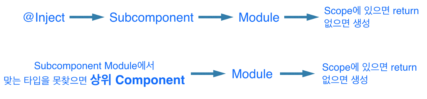 Inject로 주입을 요청받으면 SubComponent에서 먼저 연결되어있는 Module들 속에 요청받은 Dependency가 있는지 검색하고, 없으면 부모로 올라가면서 검색한다.